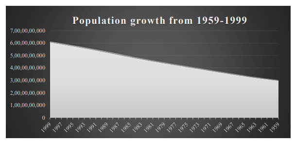 Although population growth is not the only factor for unemployment, it is one of the driving forces. The population growth from 1959 to 1999 has increased from 3 Billion to 6 Billion, as can be seen from the table below, which is a 100% increase.