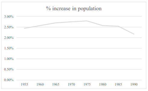 The given below chart represents the population growth rate between 1955 to 1990 in South Africa, a period when the percentage increase in the population was quite large.