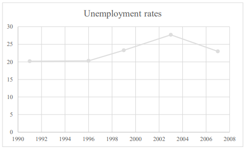 The given chart below represents the unemployment rate in South Africa from 1991 to 2007, which is approximately at the time when the population born in the above mentioned time period, would come of working and employable age.