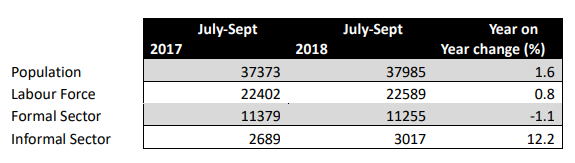 The above table gives the data of the labour market in South Africa of 2017 (July-Sept) and 2018 (July-Sept). There has been a growth rate in labour force by 0.8%, but they have been absorbed in the informal sector in the economy and not in the formal sector. In fact, some of those who were employed in the formal sector, have either lost their jobs, or shifted to the informal sector. Policy
